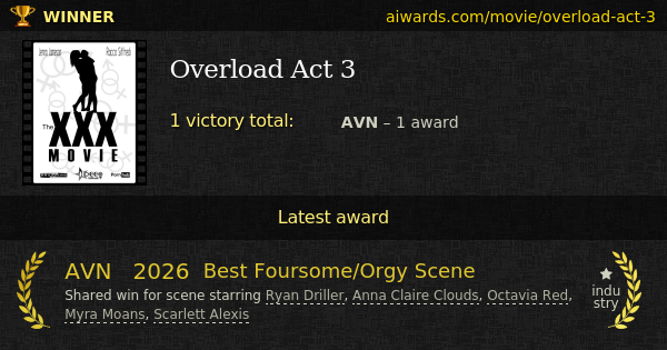 "Overload Act 3" (2025) is an award winning pornographic film shot by Parasited and Hentaied.pro Studio. Scene from this film with Ryan Driller, Anna Claire Clouds, Octavia Red, Myra Moans and Scarlett Alexis won AVN "Best Foursome/Orgy Scene" award.