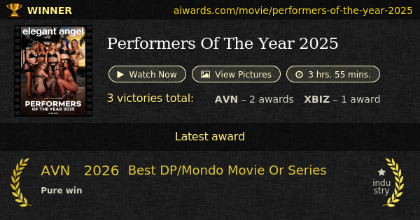 "Performers Of The Year 2025" (2025) is a XXX film directed by Sid Knox and produced by Elegant Angel. Movie consists of 5 scenes with total length of 3 hrs. 55 mins. The film contains such recognized adult themes as group sex, all-girl, anal sex, double-penetration and gonzo. Scene from the movie with Vanna Bardot, Blake Blossom, Anna Claire Clouds, Lilly Bell, Jewelz Blu, Jennifer White and Octavia Red collected AVN "Best All-Girl Group Sex Scene" award. "Performers Of The Year 2025" owned several trophies including "Best All-Girl Group Sex Scene", "Best DP/Mondo Movie Or Series" and "Best All-Sex Movie".