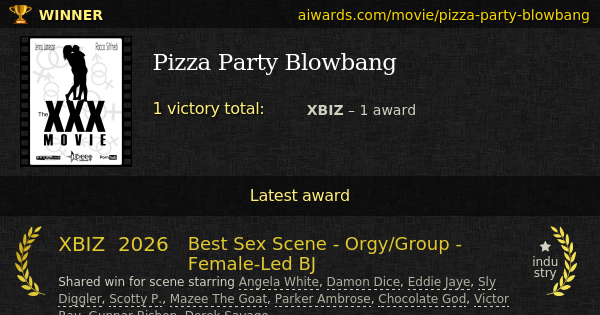 "Pizza Party Blowbang" (2025) is an awarded pornographic film created by Brazzers. Selected movie genre is group sex. Scene from this release with Angela White, Damon Dice, Eddie Jaye, Sly Diggler, Scotty P., Mazee The Goat, Parker Ambrose, Chocolate God, Victor Ray, Gunnar Bishop and Derek Savage won XBIZ "Best Sex Scene - Orgy/Group - Female-Led BJ" award.
