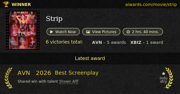 "Strip" is a 2025 prize-winning X-rated movie created by DORCEL and directed by Ricky Greenwood. Film composed of 5 sex scenes with total length of 2 hrs. 40 mins. Jayden Cole, Scarlett Alexis, Seth Gamble, Nicole Doshi and Blake Blossom starred in the movie. This release contains such recognized adult genre as group sex. By total amount of awards issued in 2026 (AVN, XBIZ and XRCO) the release holds the second position. Selected list of awards won by "Strip": "Best Screenplay", "Best Leading Actor" and "Grand Reel".