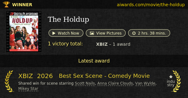 "The Holdup" (2025) is a X-rated movie shot by Digital Playground and directed by Ricky Greenwood. Film composed of 4 scenes with total length of 2 hrs. 38 mins. Scenes from the movie are in genre: group sex and anal sex. Sex action with Scott Nails, Anna Claire Clouds, Van Wylde and Mikey Star was rewarded with XBIZ "Best Sex Scene - Comedy Movie" achievement.