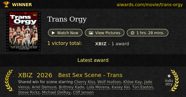 "Trans Orgy" is a 2024 prize-winning porn flick created by Gender X Films. Total film length - 1 hrs. 28 mins. Themes of this movie scenes include anal sex and group sex. Sex scene with Cherry Kiss, Wolf Hudson, Khloe Kay, Jade Venus, Ariel Demure, Brittney Kade, Lola Morena, Kasey Kei, Tori Easton, Steve Rickz, Michael DelRay and Cliff Jensen was honored with XBIZ "Best Sex Scene - Trans" achievement.