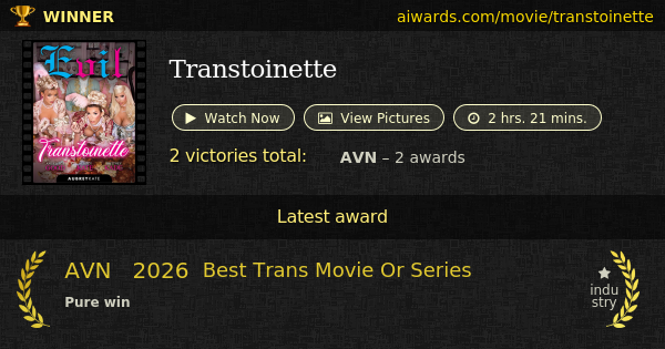 "Transtoinette" is a prize-winning pornographic flick produced by Evil Angel in 2025 and directed by Aubrey Kate. Total length: 2 hrs. 21 mins.; sex scenes count: 4. Scenes from the film feature such themes as group sex and anal sex. Scene from the movie with Aubrey Kate, Pierce Paris, Brittney Kade, Angellica Good, Austin Rex, Sage Roux and Dom Cruise won AVN "Best Trans Group Sex Scene" trophy. This film achievements include "Best Trans Group Sex Scene" and "Best Trans Movie Or Series".