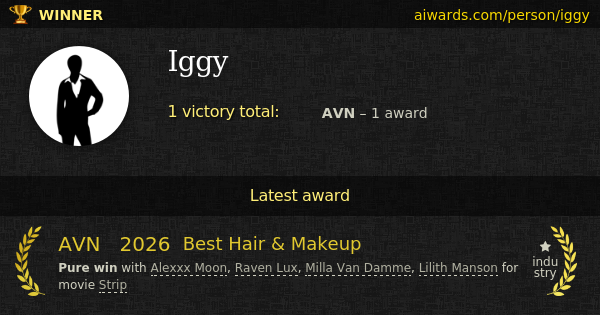 Iggy is an adult industry professional. Multiple studios including Pulse and Marc Dorcel invited Iggy to work on movies. First and only award came to Iggy in 2026 - AVN "Best Hair & Makeup" trophy.