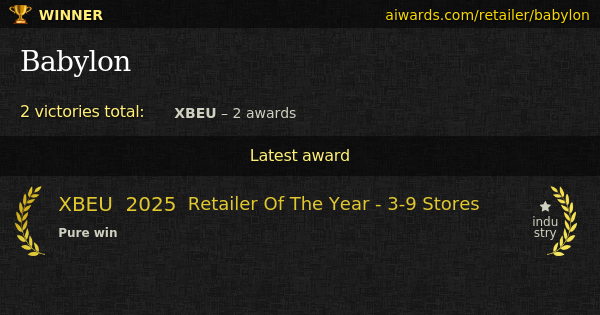 Babylon is an adult retailer. Individual awards owned by the company include "Retailer Of The Year - Boutique" and "Retailer Of The Year - 3-9 Stores".