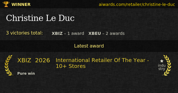 Christine Le Duc is an adult retailer. Individual awards owned by the company include "International Retailer Of The Year - 10+ Stores", "Retailer Of The Year - Chain" and "Retailer Of The Year - 10+ Stores".