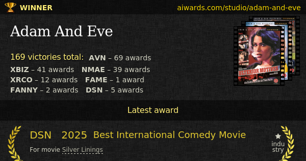 Adam And Eve is a multiple award winning adult industry studio. The company created list of titles including "The 8th Day", "Love Emergency", "Rawhide", "Bad Babes Inc." and "Babysitting The Baumgartners". Latest winning videos: "Ulterior Motives", "Silver Linings" and "Love, Sex And Robots". Will Ryder, Joone and Paul Deeb worked with the studio. All-girl, solo, threesome, group sex, parody, gonzo and epic - studio acknowledged adult themes. Totally 169 AVN, XBIZ, NMAE, XRCO, F.A.M.E., The Fannys and DSN trophies the studio won for the entire career. Adam And Eve collected four NMAE "First Choice Awards" trophies in a row. The studio got trophies in over 26 separate years. The studio individual awards include "Reuben Sturman Memorial Award", "Best Online Marketing Campaign - Company Image" and "Best Retail Chain - Large". Over 2 movies created by the company became year bestsellers.