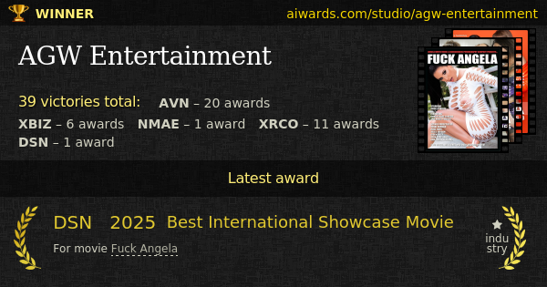 AGW Entertainment is a pornographic studio. The studio filmed list of titles including "Fuck Angela", "Angela Loves Anal 2" and "Angela Loves Women 2". Selected AGW Entertainment genres - group sex, all-girl, oral sex, gonzo, double-penetration, solo and anal sex. Two years in a row the studio won AVN "Best All-girl Movie". The studio achievements include "Best Gonzo Movie", "Best Girl/girl Series" and "Best Star Showcase".