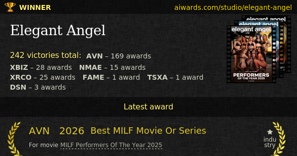 Elegant Angel is an awarded pornographic studio. Splendid "Wasteland", "Portrait Of A Call Girl", "Asa Akira Is Insatiable 2", "Asa Akira Is Insatiable 3" and "Tori Black Is Pretty Filthy" - this is only a small list of titles made by the company. Latest winning movies: "Performers Of The Year 2025", "Hollywood Whore: A Jennifer White Showcase Film" and "Visions". Graham Travis, William H. and Mason worked with Elegant Angel. Oral sex, all-girl, solo, anal sex, gonzo, threesome, double-penetration, group sex, amateur and epic - Elegant Angel recognized adult genres. Totally 242 AVN, XBIZ, NMAE, XRCO, F.A.M.E., TSXA and DSN prizes the studio won for the entire career. The studio collected five XRCO "Best Gonzo Movie" trophies in a row. Over 33 years the studio accepted different awards. Individual achievements owned by the studio include "Gonzo Studio Of The Year", "Studio Of The Year" and "International Studio Of The Year".
