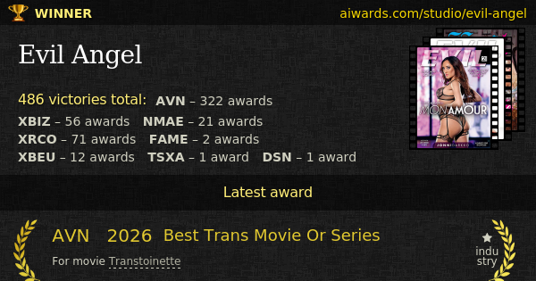 Evil Angel is an awarded adult industry studio. Evil Angel created such awarded movies as "The Fashionistas", "I Am Angela", "Fashionistas Safado: Berlin", "Buttman's European Vacation" and "Wild Goose Chase". Latest awarded movies: "Mon Amour", "Gape For Days 5" and "Transtoinette". John Stagliano, Rocco Siffredi and Belladonna directed movies for the studio. Company admitted adult features: group sex, anal sex, gonzo, amateur, all-girl, oral sex, threesome, solo, POV, epic and double-penetration. Totally 486 AVN, XBIZ, NMAE, XRCO, F.A.M.E., XBIZ EU, TSXA and DSN prizes Evil Angel collected for the entire career. The studio won XRCO "Best Gonzo Series" awards eight years in a row. Over 35 years Evil Angel kept winning awards. The company individual achievements include "Reuben Sturman Memorial Award", "Best Marketing Campaign - Company Image" and "Studio Of The Year".