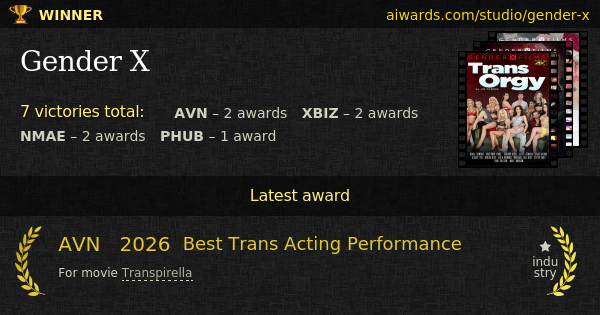 Gender X is a prize-winning adult industry studio. The company shoot list of remarkable movies including "Transpirella", "Trans Orgy", "Transgendered Bosses" and "Trans Massage". The studio got two NMAE "Best Transsexual Release" awards in a row. Individual achievements owned by the studio include "Most Popular Trans Channel".