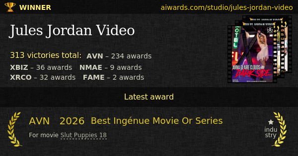 Jules Jordan Video is a prize-winning pornographic studio. Popular "Angela White: Dark Side", "The Insatiable Emily Willis", "Jenna Haze Dark Side", "Anna Claire Clouds: Dark Side" and "Jesse: Alpha Female" - this is only a small list of movies shoot by the company. Latest awarded movies are "Threesome Temptations", "Jules Jordan’s Three Ways 3" and "Anal Savages 11". Known directors including Jules Jordan, Greg Lansky and Kayden Kross worked for Jules Jordan Video. Anal sex, gonzo, oral sex, threesome, POV, double-penetration, all-girl, amateur, group sex and solo - Jules Jordan Video high-ranked adult themes. The company won 313 AVN, XBIZ, NMAE, XRCO and F.A.M.E. awards in total. Seven years in a row the studio won AVN "Best Interracial Release". The studio collected awards in over 23 years range. Direct achievements owned by Jules Jordan Video include "Best New Video Production Company", "Up-and-Coming Studio Of The Year" and "Studio Of The Year".