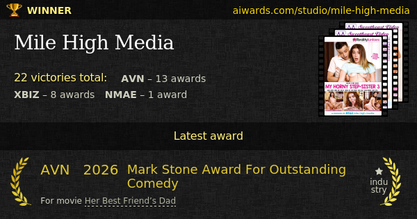 Mile High Media is a multiple award winning adult movies studio. Mile High Media made such movies as "Buck Angel Superstar", "The Candidate", "Her Best Friend’s Dad", "Lesbian Stepmother 8" and "My Horny Step-Sister 3". Mile High Media acknowledged adult themes - all-girl and group sex. Mile High Media collected two XBIZ "Best Actress - All-girl Release" trophies in a row. Over 12 years the studio accepted different awards. Direct trophies owned by Mile High Media include "Best Production Company".