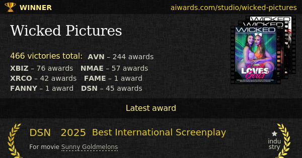Wicked Pictures is a pornographic studio. Known "Suicide Squad XXX: An Axel Braun Parody", "Underworld", "The Preacher's Daughter", "The Rocki Whore Picture Show: A Hardcore Parody" and "Double Feature!" - these are only few movies filmed by the studio. Latest winning titles: "The Hunger", "American Stud" and "Sunny Goldmelons". Axel Braun, Brad Armstrong and Herve Bodilis directed movies for Wicked Pictures. Studio top-ranked adult features - solo, oral sex, all-girl, anal sex, group sex, double-penetration, parody, gonzo, epic, amateur and threesome. Wicked Pictures gained totally 466 AVN, XBIZ, NMAE, XRCO, F.A.M.E., The Fannys and DSN trophies. The company won AVN "Best Actress - Video" awards six years in a row. The studio collected awards in over 31 years range. Wicked Pictures collected several individual awards including "Best Overall Marketing Campaign - Company Image", "Best Overall Marketing Campaign - Individual Project" and "Best DVD Authoring".