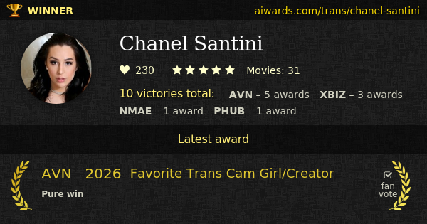 Chanel Santini is an American award winning pornographic transsexual performer. In Albuquerque, New Mexico, US on January 7 Santini was born. Currently Chanel Santini appeared in over thirty pornographic film scenes. Chanel Santini starred in scenes with Cherie DeVille, Lance Hart, Will Havoc and Wolf Hudson. "Chanel Santini: TS Superstar" and "Trans-Active" - these are only few videos where Chanel Santini performed. Totally 10 AVN, XBIZ, NMAE and Pornhub prizes Chanel Santini won for the entire career. Santini won four fan prizes (AVN and Pornhub). Santini won two AVN "Favorite Trans Porn Star" awards in a row. Chanel Santini took "Performer of the Year" 3 times: AVN-2019, XBIZ-2018, XBIZ-2019. Chanel Santini collected several personal awards including "Transsexual Performer Of The Year", "Favorite Trans Cam Girl/Creator" and "Trans Performer Of The Year".