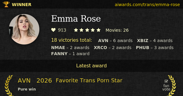 Emma Rose is an award winning pornographic transsexual performer. Currently Emma Rose appeared in over twenty pornographic film scenes. Rose made few appearances in such remarkable movies as "Gorgons And Goddesses", "The Cum Sauna" and "Measure Me". Emma Rose shoot scenes with Ten15Group, Adult Time and Oopsie!. Totally 18 AVN, XBIZ, NMAE, XRCO, Pornhub and The Fannys prizes Rose won for the entire career. Emma Rose was five times fan-voted (AVN, XBIZ, NMAE and The Fannys). Rose got two AVN "Trans Performer Of The Year" awards in a row. Rose won highest adult industry trophy, "Performer of the Year", 7 times: AVN-2023, AVN-2024, The Fannys-2025, XBIZ-2023, XBIZ-2024, XRCO-2023, XRCO-2024. Emma Rose collected several personal awards including "Favorite Trans Porn Star", "Favorite Trans Performer" and "Best Transsexual Performer".