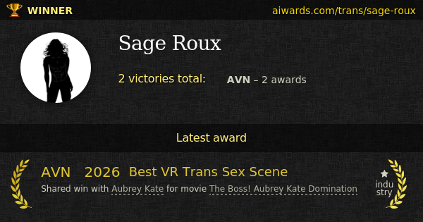 Sage Roux is a pornographic transsexual performer. Among Roux roles, Sage Roux starred in classy movies "Transtoinette" and "The Boss! Aubrey Kate Domination". Sage Roux shoot scenes with Evil Angel, Aspen Kate Enterprises and TS Virtual Lovers. Few trophies gained by Roux: "Best Trans Group Sex Scene" and "Best VR Trans Sex Scene".