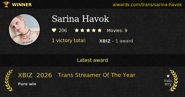 Sarina Havok is an awarded pornographic transsexual performer. Havok obtained first and only trophy in 2026 (XBIZ "Trans Streamer Of The Year").